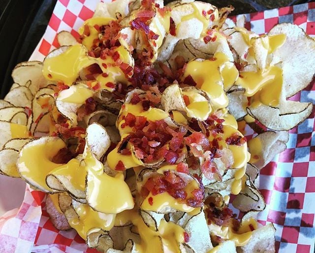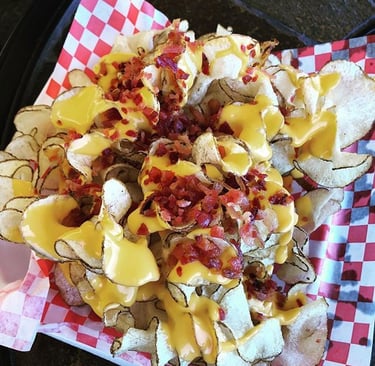 Fries covered in warm cheese sauce, topped with crispy bacon.